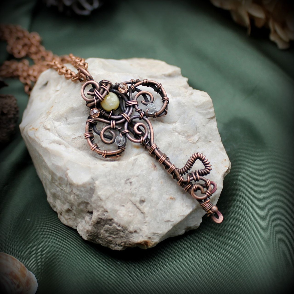 Медный кулон "Ключ Инзе". Медный кулон-ключ на цепочке. Состаренная медь, шпинель, желтый опал. Очень легкое, сказочное украшение в золотистых тонах. ---------------------------------- Инзе в городах у побережья знают хорошо. Она нечасто спускается с гор, и в последнее время всё реже и реже. Она юна и прекрасна, но даже самые древние горожане помнят её такой же, Инзе совсем не меняется. Она проходит через город, словно ищет кого. Иногда стучит в двери и окна. И некоторые из горожан получают он неё подарки. Это может быть что угодно - обкатанная морем галька с пляжа, шелковый платочек, старый медный ключ на цепочке. И все знают - подарки Инзе всегда приносят счастье! --------------------------- Длина кулона 7 см. Ширина 3 см. Длина цепочки 60 см. #медныесказки #ручнаяработа #медныйкулон #ключ #кулон_ключ #ключик #кулонручнойработы #украшенияручнойработы #украшенияизмеди #wirewrap #wirework