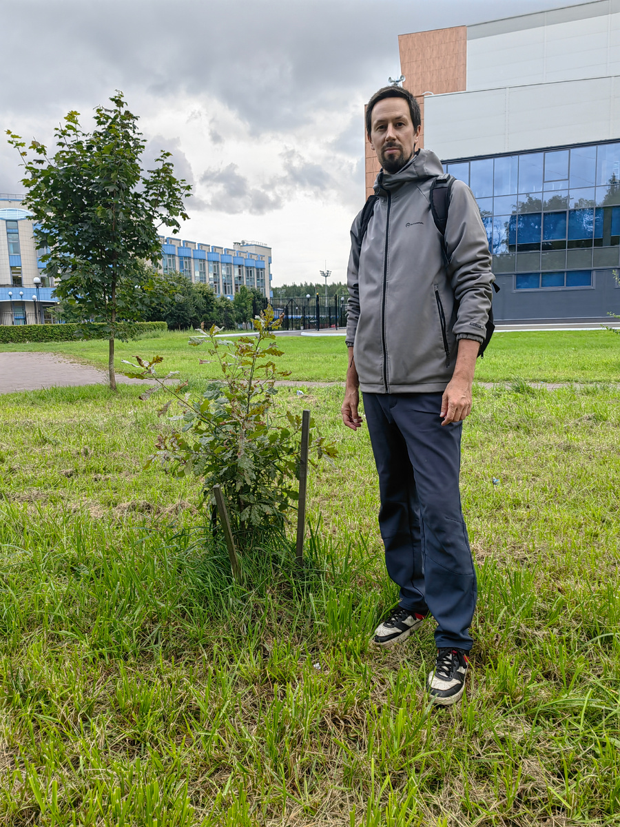Во время прогулки по улице Верности в Петербурге мама обратила мое внимание на два неприметных деревца, которые растут напротив недавно возведенной школы ФК "Зенит". Она сказала, что это дубки, которые были посажены администрацией Калининского района несколько лет назад - саженцы вырастили из желудей дуба, что растёт в Летнем саду.