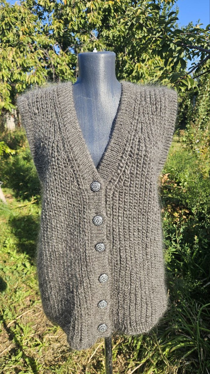 Встала в пол-шестого и его доделала Со вчера оставалось жилет сшить по бокам, довязать планку на левый борт, выметать петли, пришить пуговицы и постирать Сейчас пойдём стирать После стирки он станет другим
