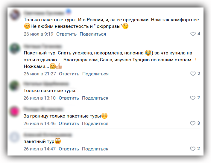 Многие мои подписчики в ВК также считают, что путешествовать пакетным туром безопаснее. Почему? Потому что у туроператоров есть обязательства перед покупателями. «Если что-то случится, нас хотя бы точно вернут из другой страны домой», – сказала одна женщина.