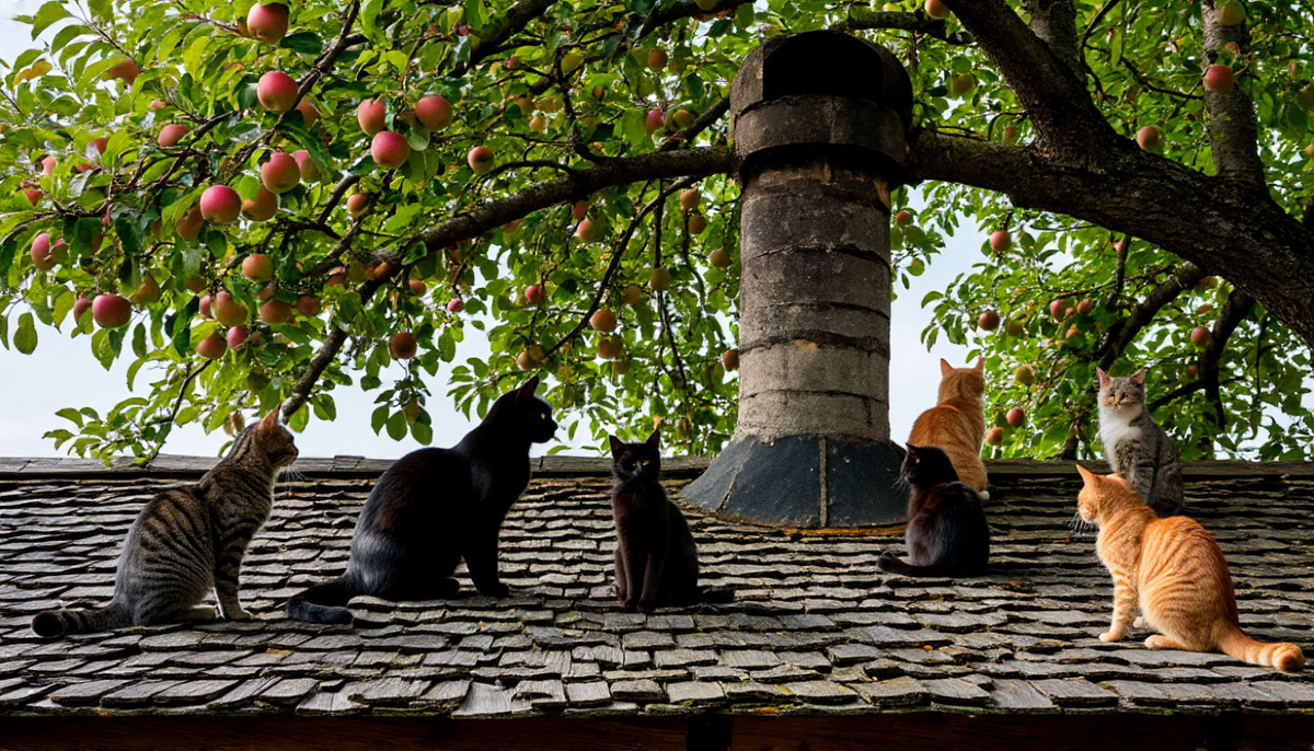Есть у местных кошек заветное местечко, куда они частенько приходят поделиться новостями друг с другом и вообще поболтать о том - о сём. Вообще-то таких местечек в каждом селении бывает не мало, но здесь чаще всего кошки предпочитали крышу избы бабушки Матрёны, стоявшей несколько поодаль от всех прочих домов среди старых черёмух с рябинами, прикрывавших своими ветвями половину крытой крашеным тёсом кровельки.