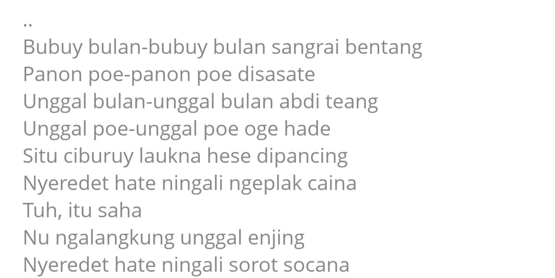 У меня эта песня ассоциицируется с японской "Yoimachigusa" - только там слова "сегодня луна не взойдëт", хотя общий смысл тот же. Надо сделать концертный диптих. Правда, где исполнять - не понятно, хотя, дома точно можно. Главное, надеть модерновую кебайю и напихать в волосы палок, чтобы был собирательный сунда-японовый образ.