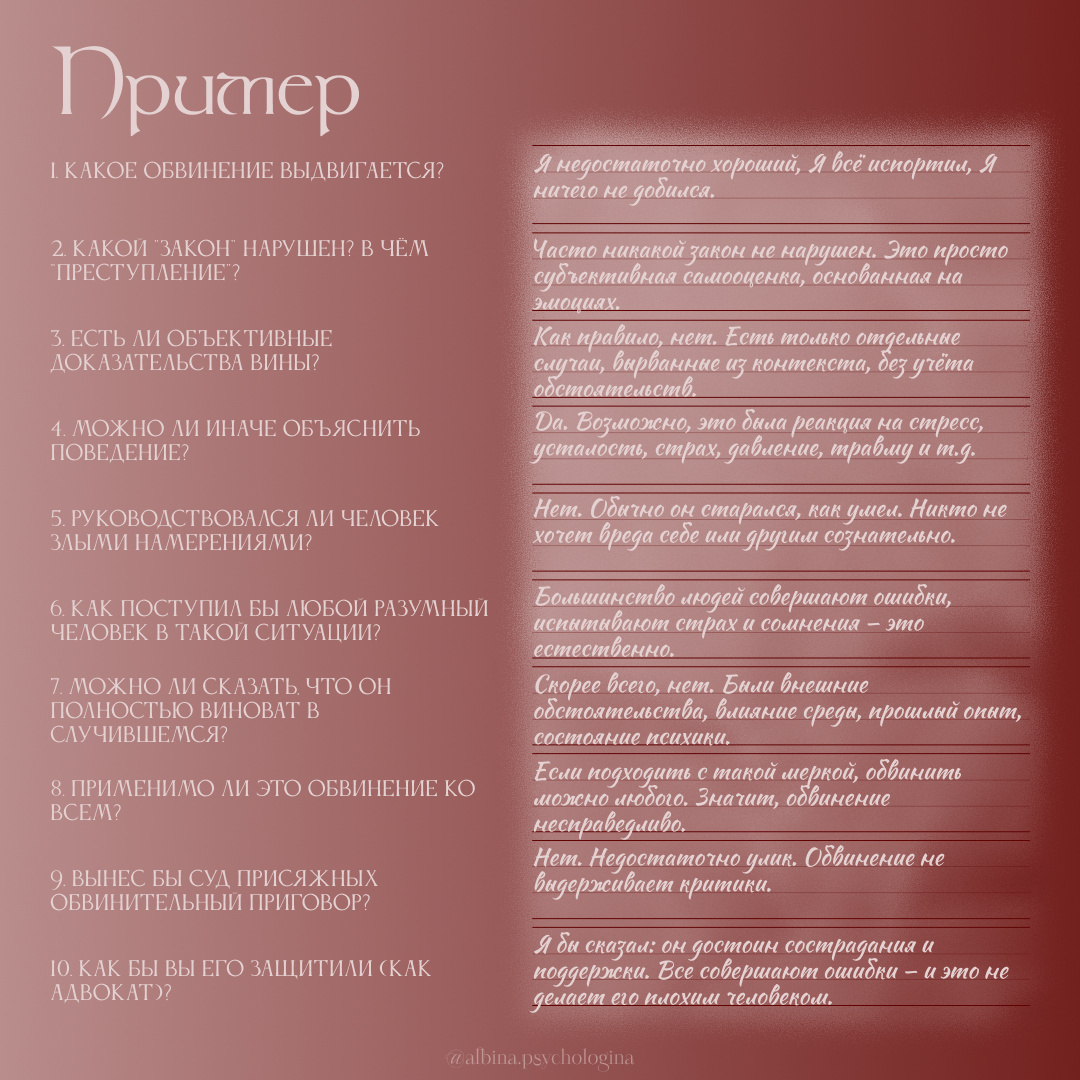- Образный подход: внутренний критик — как обвинитель, а вы — как адвокат в суде.