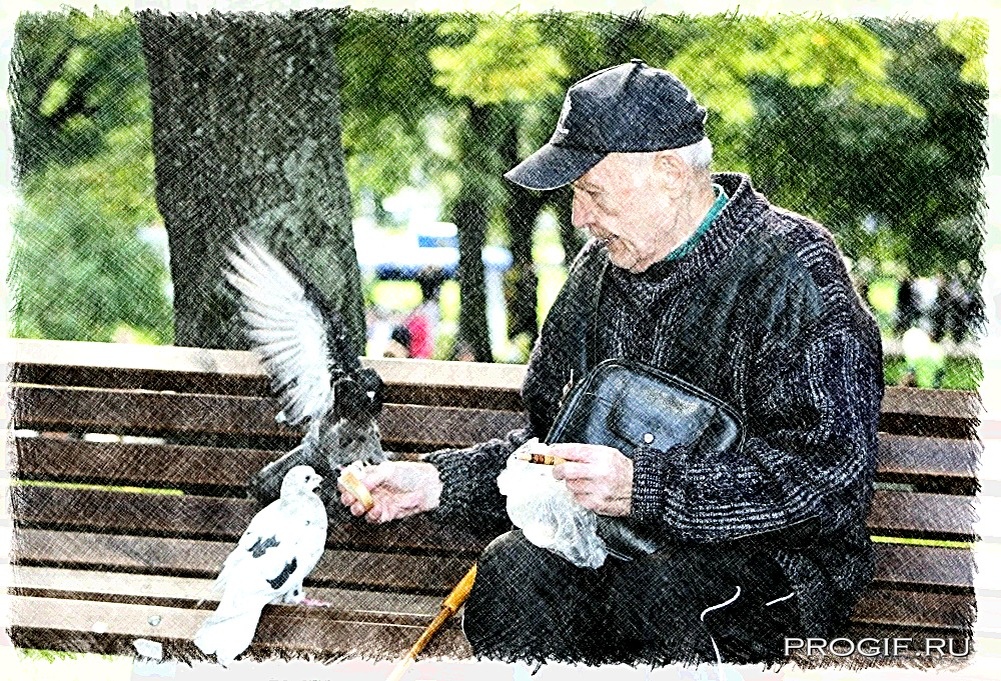 Рядом, на соседней скамейке, сидел пожилой мужчина в аккуратно отглаженной рубашке и с тростью. Он кормил голубей крошками хлеба, и на его лице было выражение абсолютного, безмятежного покоя.