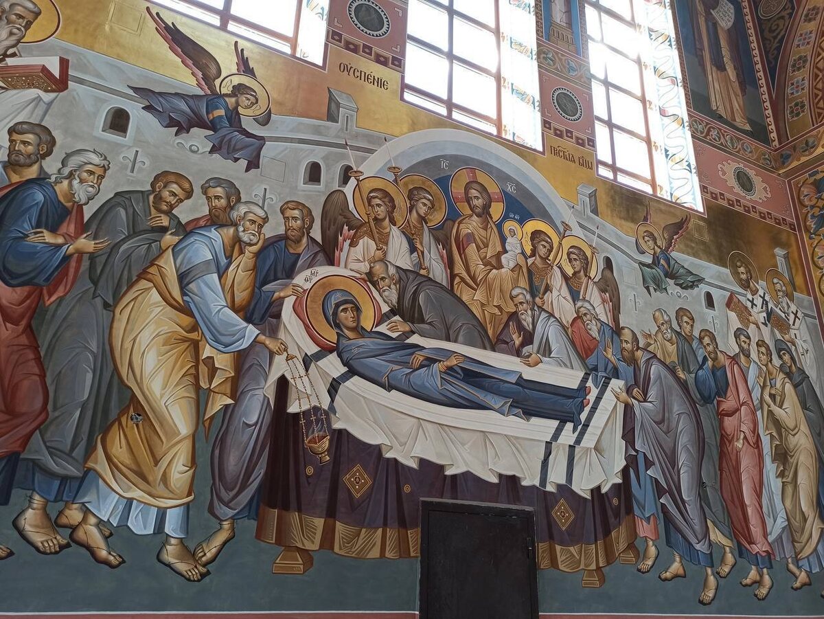 Иконография Успения Пресвятой Богородицы Сюжетное решение иконы окончательно сложилось к XIII веку. Мастера смогли изобразить почти все моменты, которые нам известны об Успении Пресвятой Богородицы из Предания. Посредине иконы изображен одр, на котором покоится тело Пресвятой Девы. Как правило, он покрыт тканью багряного цвета, и это неслучайно: багрянец всегда был атрибутом императорской власти, и применение этого оттенка в случае с Богородицей указывает на Ее царское достоинство как Владычицы и Царицы Небесной. Вокруг одра расположились апостолы. Количество фигур может быть разным, однако на всех изображениях присутствуют Петр и Иоанн. Петр держит в руках кадильницу и окуривает ложе Богородицы фимиамом. Иоанн же просто оплакивает Пречистую, склонившись над постелью. Перед одром чаще всего стоит свеча. За одром стоит Спаситель. Он окружен мандорлой — огромным нимбом, символизирующим собою божественную славу. В руках у Него — упеленанный младенец. Это — душа Пресвятой Богородицы. Т