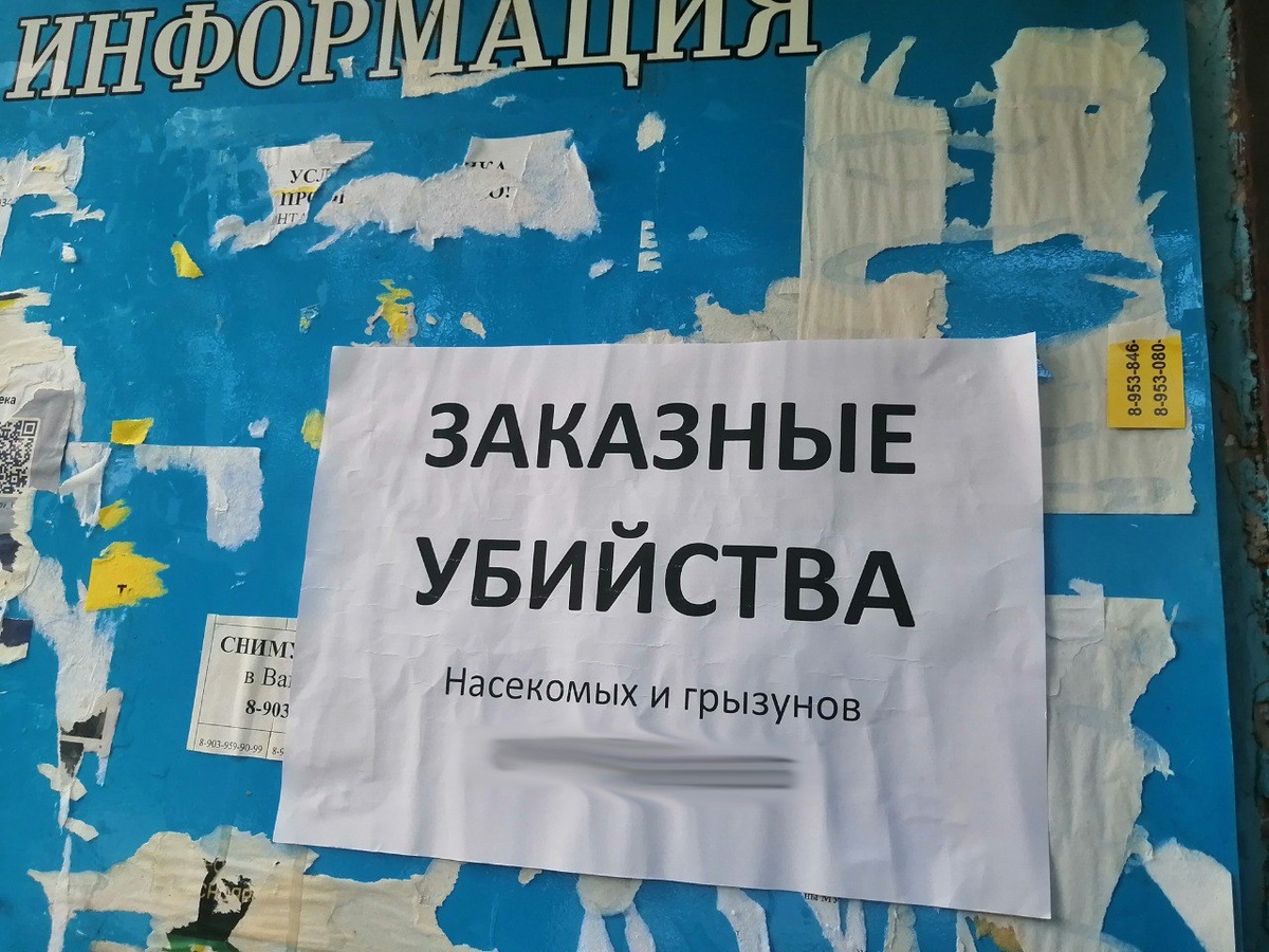 🤭 Интересный маркетинговый ход придумал некто, оказывающий услуги по борьбе с вредителями. 📌 Объявление на одном из домов на улице Б. Полевого, на первый взгляд, очень пугает. Читая его первую часть, в которой крупным шрифтом написано ➡ «Заказные убийства», цепенеешь от ужаса. Но ясность кроется во второй части, написанной более мелко: «насекомых и грызунов». Согласитесь, придумка автора удивляет. Скорее всего, такое объявление точно не останется без внимания.