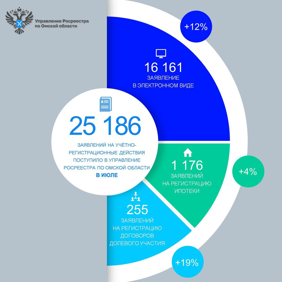 В июле 2025 года в Управление Росреестра по Омской области от жителей региона поступило 25 186 заявлений на проведение учетно-регистрационных действий, что на 17 % больше, чем в июне (21 563), и на 56 % больше, чем в январе. На первом месте по востребованности традиционно занимает услуга по государственной регистрации права – 17 544 заявления, на втором – государственный кадастровый учет – 6 125 заявлений, на третьем – единая процедура – 1 517 обращений. Предпочтение электронному взаимодействию с Росреестром отдали более половины обратившихся за государственной услугой лиц – 16 161, или 65 % пакетов документов поступило онлайн (в июне – 14 427). Количество заявлений на регистрацию ипотеки, по итогам июля 2025 года, увеличилось на 4 %. Так, на регистрацию ипотеки поступило 1 176 заявок, из которых 71 % (840) – в электронном виде (в июне 2025 зарегистрировано 1 129 ипотек). На регистрацию договоров долевого участия в строительстве подано 255 заявок. Все заявления поступили в электронном