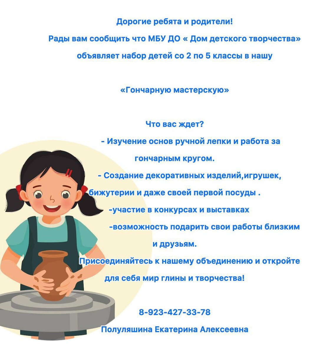 Дорогие ребята и родители! В Парабельском Доме Детского творчества открывается «Гончарная мастерская»! Эта уникальная возможность нашим детям окунуться в мир волшебной глины🏺В гончарной мастерской дети освоят различные техники работы с глиной, делать игрушки, украшения, декоративные предметы для дома и быта и даже свою собственную -самую настоящую посуду☕️научатся покрывать изделия красками и глазурями 🖌️🧑🎨А работа за гончарным кругом точно не оставит равнодушным ни одного ребенка🤗 Занятия с природной глиной приносит огромное удовольствие, пользу и радость🌸 ждем деток со 2 по 5 классы😊 пишите/звоните 8-923-427-33-78 Полуляшина Екатерина Алексеевна