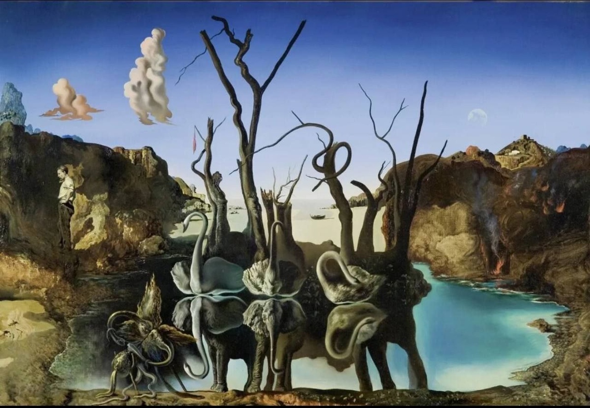 ЛЕБЕДИ, ОТРАЖАЮЩИЕСЯ В СЛОНАХ Картина написана испанским художником Сальвадором Дали в 1937 году. Находится в частной коллекции. На переднем плане мы видим спокойное озеро. На его поверхности отражаются три лебедя. Однако, если внимательно присмотреться, отражения лебедей трансформируются в изображение слонов. Слоны изображены с длинными, тонкими ногами, что является характерным мотивом для Дали. На заднем плане — скалистый пейзаж в приглушенных, теплых тонах. Вся картина пронизана ощущением спокойствия и безмятежности, но в то же время таит в себе некую ирреальность и тревогу. ❤️Разберëм картину: Лебеди: Традиционно символизируют грацию, красоту, чистоту, любовь. В контексте картины, можно предположить, что они представляют собой внешнюю, видимую, красивую сторону личности, ее идеализированный образ. Слоны: У Дали часто изображались с длинными, тонкими паучьими ногами. Они могут символизировать подавленную агрессию, мощь, но в то же время уязвимость и хрупкость. Их неустойчивость