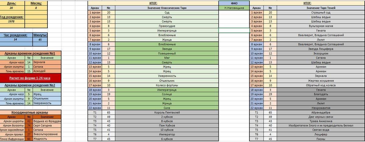 А1 + А2 Суд + Смерть - Предвестие грядущего; (пер) - Прикрытие важных проблем шуткой, маской. А1 + А3 Суд + Смерть - Предвестие грядущего; (пер) - Прикрытие важных проблем шуткой, маской. А1 + А4 Суд + Правосудие - Оценка поведения чел-а по закону и по моральным канонам / Самокритичность; (пер) - Попытки разобраться с партнерами, иски. А1 + А5 Суд + Императрица - Зарождение принципиально нового; (пер) - Нововведение, одобрение. А1 + А6 Суд + Влюбленные - Предопределенность поступков; (пер) - Путь к исполнению давно задуманного. А1 + А7 Суд + Жрица - Тайна полярности. Бинер. Двоица. Двойня; (пер) - Таинственная истина. А8 + А9 Влюбленные + Звезда - Надежда, неослабевающая ни при каких обстоятельствах; (пер) - Упущенные возможности. А8 + А10 Влюбленные + Повешенный - Добровольное рабство (в т. ч. любовное); (пер) - Насилие, убийства. А8 + А11 Влюбленные + Маг - Связь с высокопоставленным лицом; (пер) - «Проваленный» фокус. Падение с