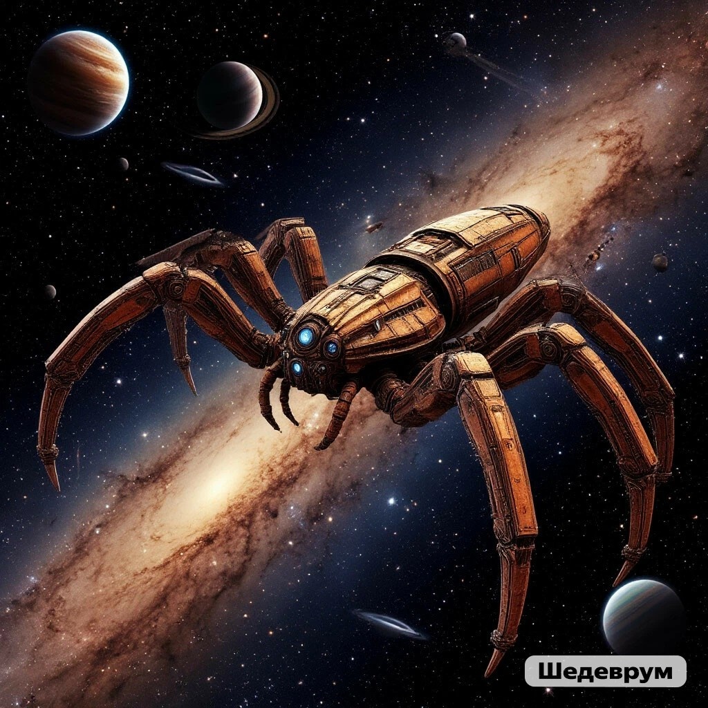 Рокх, всё ещё восстанавливающий силы после недавней битвы, внезапно почувствовал мощный ментальный всплеск. Это было похоже на сигнал тревоги, пробуждающий его внимательность. Он резко обернулся в сторону источника сигнала и застыл в изумлении. На месте луны спасённой планеты, где раньше висел холодный спутник, теперь клубился хаос. Луна была взорвана, и её обломки разлетались в космосе, образуя тысячи астероидов. Этот акт насилия оставил за собой зияющую пустоту, но не это привлекло внимание Рокха. Вместо луны, на её месте теперь парил огромный корабль, напоминающий гигантского металлического паука. Его корпус был покрыт множеством антенн и щупалец, которые, казалось, ощупывали пространство вокруг. Рокх сразу понял, что этот корабль был замаскирован и прошёл вместе с основным флотом, оставаясь незаметным до нужного момента. — Как я мог пропустить это? — подумал Рокх, осознавая свою ошибку. Он знал, что его противники хитры и коварны, но не ожидал, что они смогут так искусно замаскиров