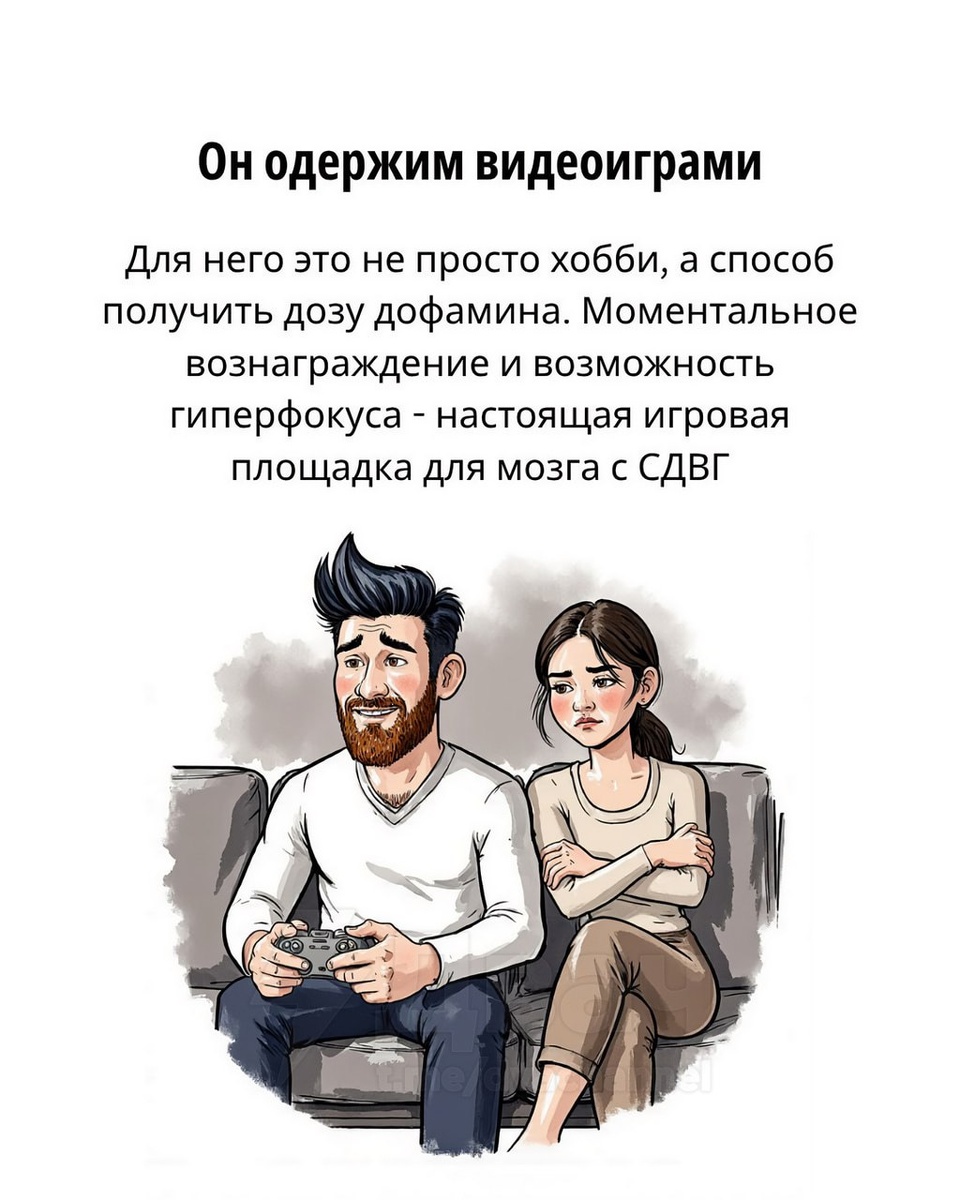 Эксперты назвали шесть признаков, что у вас может быть СДВГ СДВГ — это состояние, при котором сложно сосредоточиться, контролировать себя и оставаться спокойным. Что может на это указывать: 🟠Сильная увлечённость играми; 🟠Очень быстрый шаг; 🟠Настроение меняется в секунду; 🟠Кофе не даёт эффекта; 🟠Постоянно теряются вещи; 🟠Трудно слушать других. Узнали себя? Первое же изображение... Источник: t.me/dvachannel