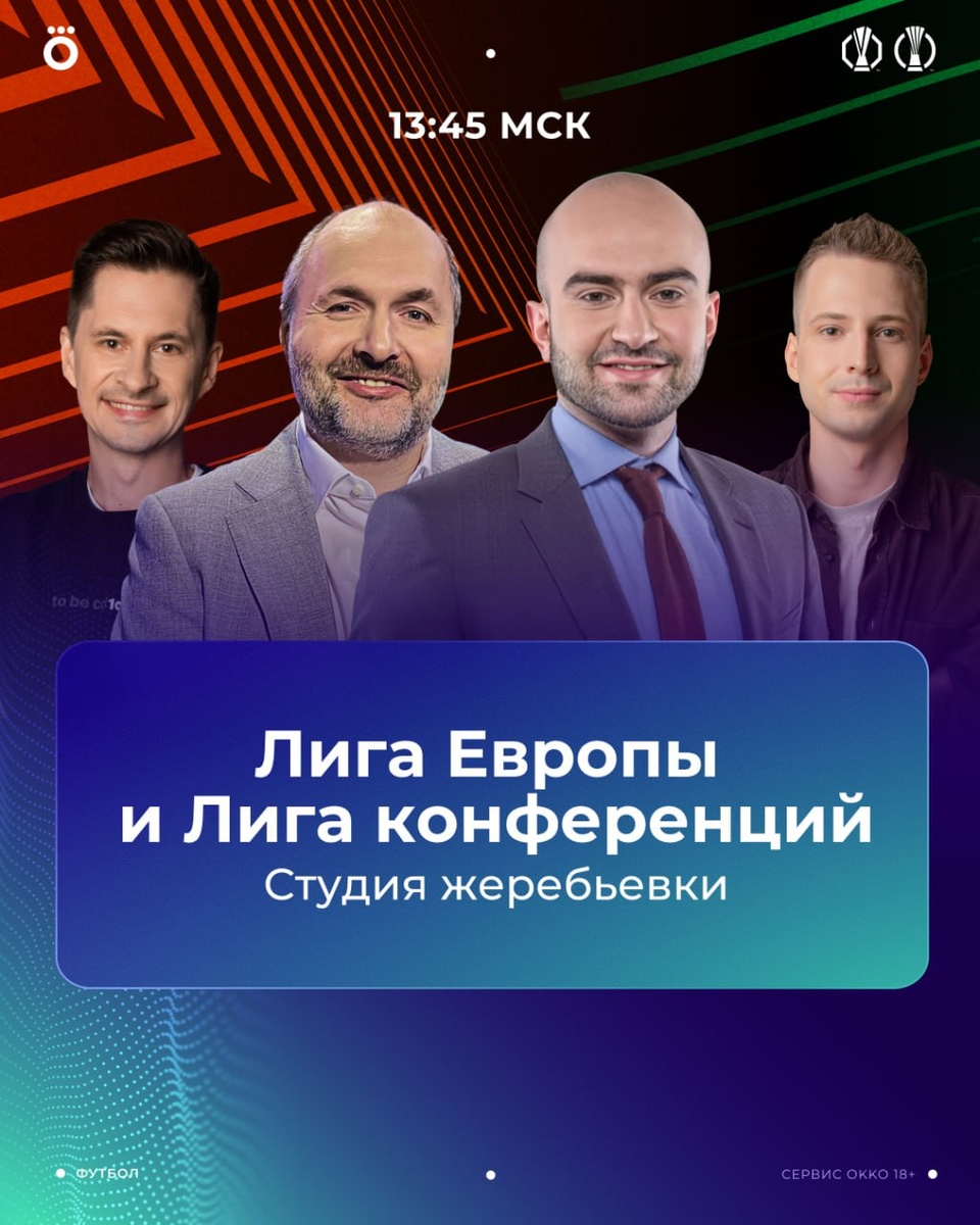 🏆🏆 Собираемся в студии перед жеребьевкой общих этапов ЛЕ и ЛК. Пупшев, Саприн, Арустамян и Алхазов ждут тебя в 13:45. Смотри в сервисе Okko, на YouTube или в VK Видео.
