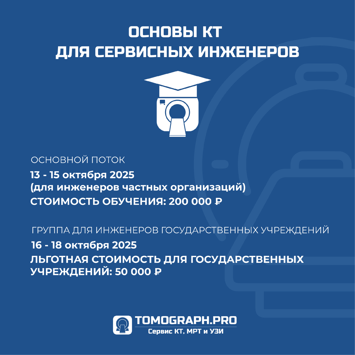 Всем привет! Поздравляем всех с Днем Знаний! Уважаемые коллеги, мы расширяем портфолио наших образовательных продуктов! Приглашаем вас на новый тренинг «Основы КТ для сервисных инженеров», который также пройдет этой осенью. Обучение построено на гармоничном сочетании теории и практики на КТ 🪛 Тренинг проходит в формате 3-дневного интенсива и органично вписывается в график проведения обучений по МРТ. Если вы еще про него не слышали, то обязательно переходите в наш Телеграм (ссылки ниже). 📅 Даты проведения: 13 - 15 октября (для инженеров частных организаций) 16 - 18 октября (для инженеров государственных бюджетных учреждений) 6 - 11 октября (Основы МРТ для инженеров частных организаций) 20 - 25 октября (Основы МРТ для инженеров государственных бюджетных учреждений) Таким образом, вы сможете совместить сразу два обучения в комфортное время. Стоимость обучения — 200 000 ₽ Для государственных бюджетных учреждений действуют льготные условия. Стоимость обучения — 50 000 ₽ Переходите в наш T