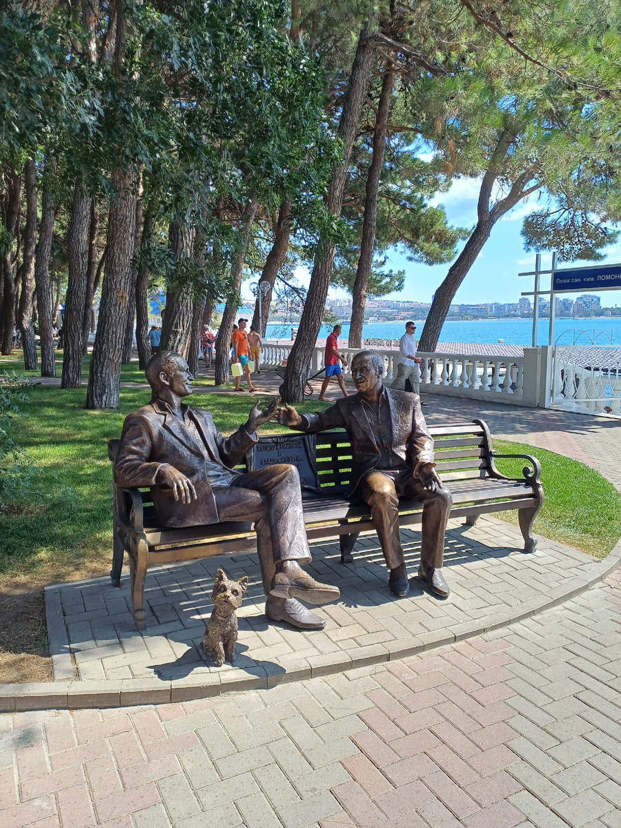Например, первый раз мы приехали в Геленджик в 2019м году и тогда не было очень симпатичного памятника двум нашим замечательным актёрам – Владимиру Этушу и Василию Лановому. В районе улицы Маячной в 2024м году открыли скамейку великим артистам Василию Семеновичу Лановому и Владимиру Абрамовичу Этушу.Оба они не раз бывали на кубанском курорте. Этуш много лет прилетал для участия в фестивале «Южные ночи». А Лановой последние годы даже проживал в Геленджике.Идея создания памятника принадлежит жёнам выдающихся артистов Елене Этуш и Ирине Купченко. Мэрия пошла навстречу инициативе и выделила место на центральной набережной. А Елена Этуш с Ириной Купченко на свои личные средства заказали памятник скульптору Александру Доронину, который и воплотил их идею в композицию «Дружеская беседа».