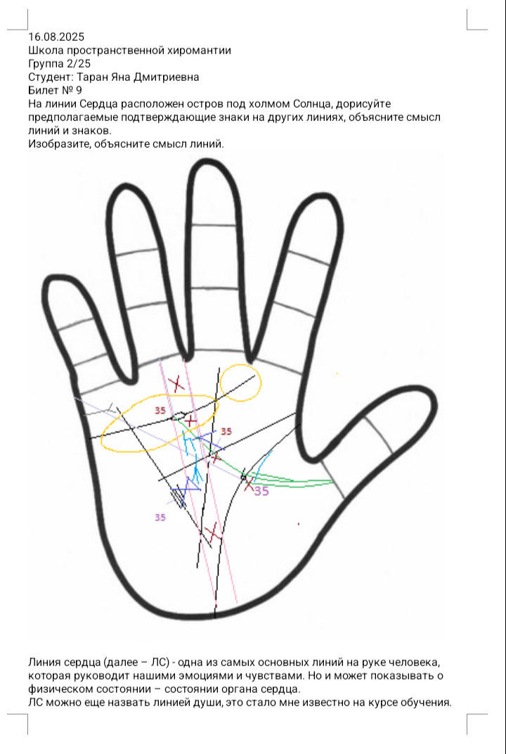 🚩На линии Сердца расположен остров под х. Солнца, дорисуйте предполагаемые подтверждающие знаки на других линиях, объясните их смысл🚩