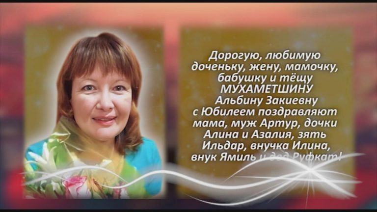 Дорогую, любимую доченьку, жену, мамочку, бабушку и тёщу МУХАМЕТШИНУ Альбину Закиевну с Юбилеем поздравляют мама, муж Артур, дочки Алина и Азалия, зять Ильдар, внучка Илина, внук Ямиль и дед Руфкат Мы пожелаем искренне тебе
