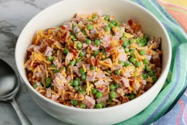 - В салатнице смешайте маринованный лук, консервированный горошек, яйца, отварное мясо и морковь.