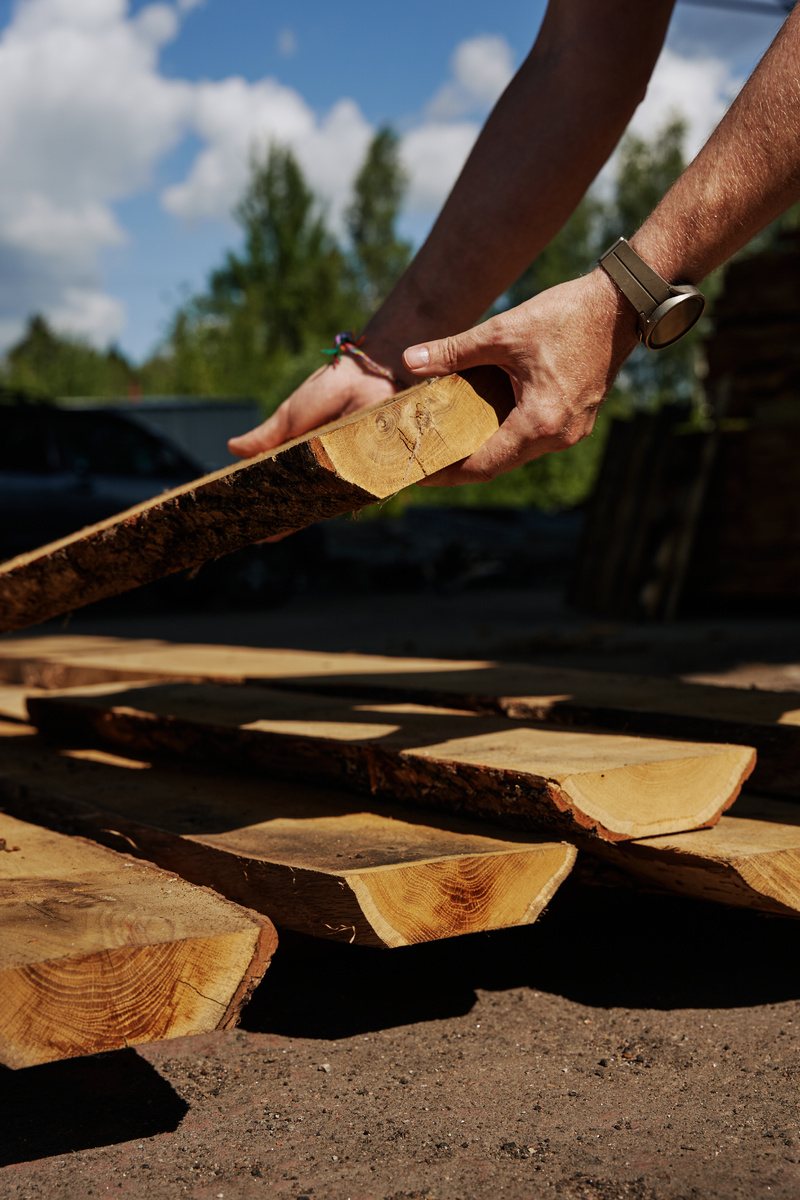 Цикл начинается с сортировки необрезных дубовых досок по породе, влажности и дефектам. Для подоконников берем стабильный европейский дуб без ядровой гнили, с минимальной кривизной, далее проверяем влажность влагомером — целевой диапазон после камерной сушки обычно 6–8% для стабильной геометрии в эксплуатации. Доски проходят разметку по направлению текстуры, чтобы будущая ламель дала ровный рисунок и общее полотно выглядело цельно в интерьере. Необрезной материал распускаем на форматных станках, снимаем обзол, кромкуем, затем калибруем толщину на рейсмусах. После первичного раскроя дефектуем — вырезаем сучки, трещины, смоляные карманы; заготовки проходят сортировку по цвету и плотности, чтобы щит не «пятнил». Ламели строгаем для идеальной геометрии кромки, чем повышаем площадь адгезии, при необходимости делаем микрошип или подбираем цельноламельную схему без стыков по длине. Отобранные ламели комплектуем «пакетами»: чередуя годичные слои и направление волокон для балансировки внутренних