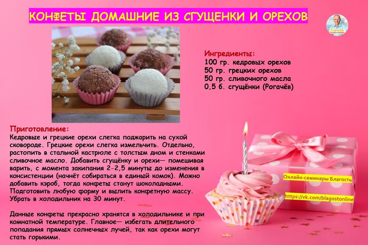 🍭 КОНФЕТЫ ДОМАШНИЕ ИЗ СГУЩЕНКИ И ОРЕХОВ 🌀 Ингредиенты: 100 гр. кедровых орехов 50 гр. грецких орехов 50 гр. сливочного масла 0,5 б. сгущёнки (Рогачёв) 🌀 Приготовление: Кедровые и грецкие орехи слегка поджарить на сухой сковороде. Грецкие орехи слегка измельчить. Отдельно, растопить в стальной кастрюле с толстым дном и стенками сливочное масло. Добавить сгущёнку и орехи— помешивая варить, с момента закипания 2-2,5 минуты до изменения в консистенции (начнёт собираться в единый комок). Можно добавить кэроб, тогда конфеты станут шоколадными. Подготовить любую форму и вылить конфетную массу. Убрать в холодильник на 30 минут. Данные конфеты прекрасно хранятся в холодильнике и при комнатной температуре. Главное— избегать длительного попадания прямых солнечных лучей, так как орехи могут стать горькими.