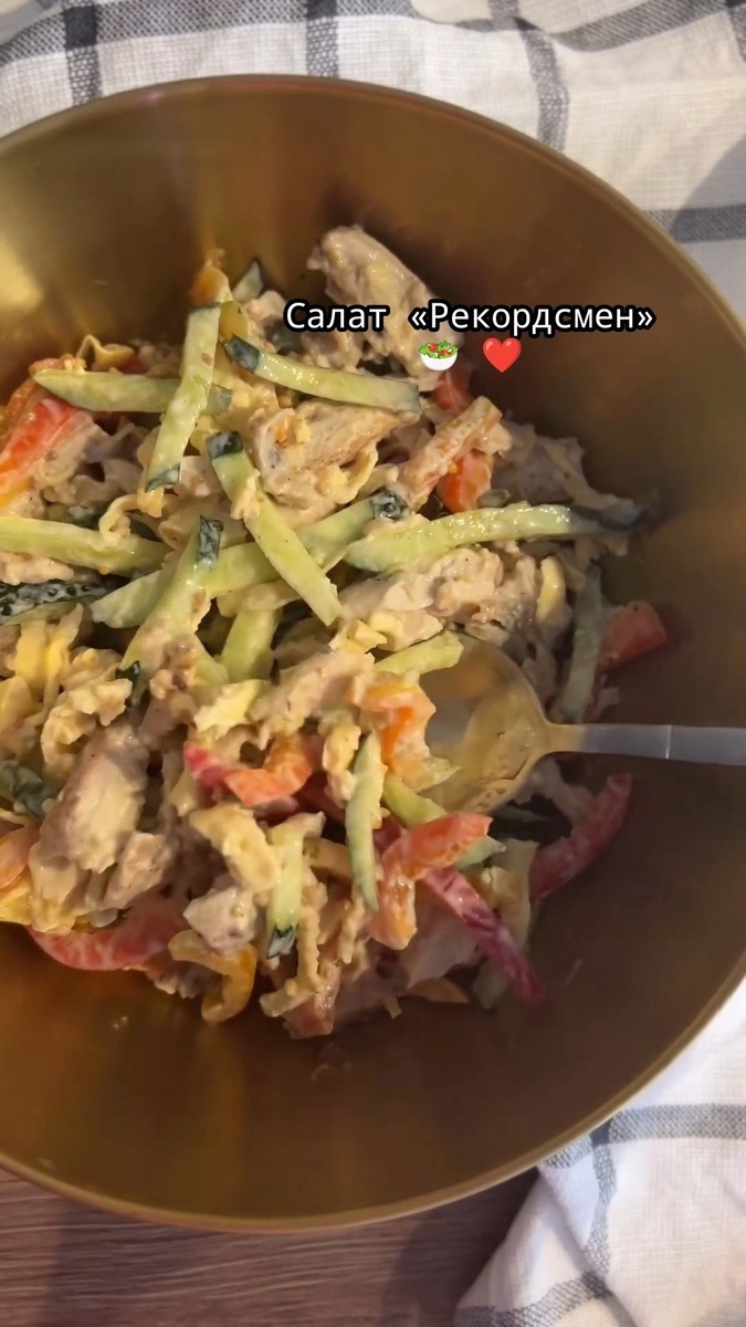 Привет, мои дорогие! 💖 Обожаю, когда можно приготовить что-то невероятно вкусное, не потратив на это кучу времени. И сегодня я хочу поделиться с вами именно таким рецептом! Это салат «Рекордсмен». Он получается таким ярким, таким сочным, с хрустящими овощами и нежной курицей… М-м-м, это просто песня!