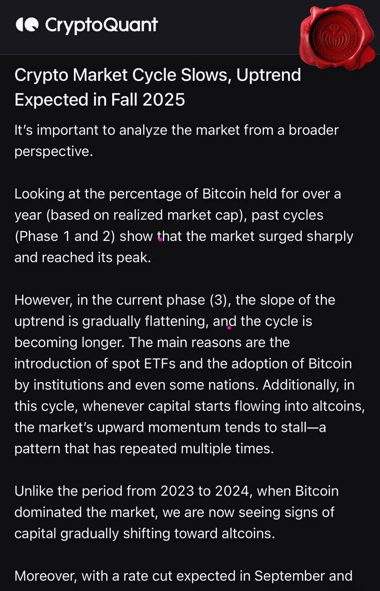 🔖CryptoQuant: “Мы наблюдаем признаки постепенного перераспределения капитала в сторону альткоинов. Более того, с ожидаемым снижением ставки в сентябре и возможным одобрением спотовых ETF для альткоинов в октябре, рыночные перспективы на осень и зиму 2025 года после текущей фазы консолидации представляются оптимистичными. С точки зрения цикла любые дополнительные коррекции могут предоставить привлекательную возможность»