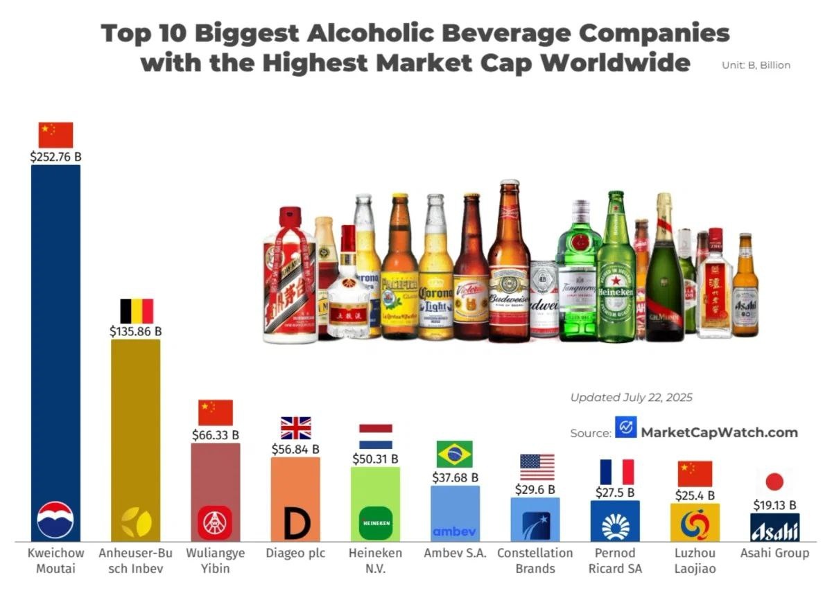 Вы гарантированно не знаете двух из топ-3 мировых производителей алкоголя. Потому что они ... китайские 🙈 10 крупнейших компаний по производству алкогольных напитков с самой высокой рыночной капитализацией 🍀 Три китайские фирмы (Moutai, Wuliangye, Luzhou Laojiao) занимают места 1, 3 и 9, подчеркивая глобальное господство Baijiu. Пивные гиганты — AB InBev и Heineken — по-прежнему занимают значительные позиции на 2-м и 5-м местах. Игроки рынка премиальных крепких спиртных напитков (Diageo, Pernod Ricard, Constellation) заполняют средние позиции, что отражает устойчивый спрос на высококачественные спиртные напитки. Two 🍻 or three 🍺 🍺 🍺 😂