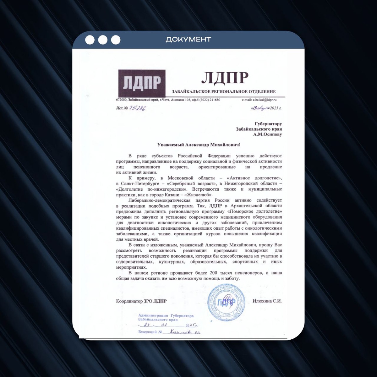 Обращение губернатору Забайкальского края Координатор Забайкальского отделения ЛДПР Светлана Илюхина направила губернатору Александру Осипову предложение рассмотреть создание программы поддержки для старшего поколения. Такая программа поможет пенсионерам участвовать в оздоровительных, культурных, образовательных и спортивных мероприятиях, способствуя их активной и здоровой жизни. Во многих регионах уже успешно действуют аналогичные инициативы, направленные на продление социальной и физической активности пожилых людей. Надеемся, что эта идея найдет поддержку и в Забайкальском крае. #лдпр