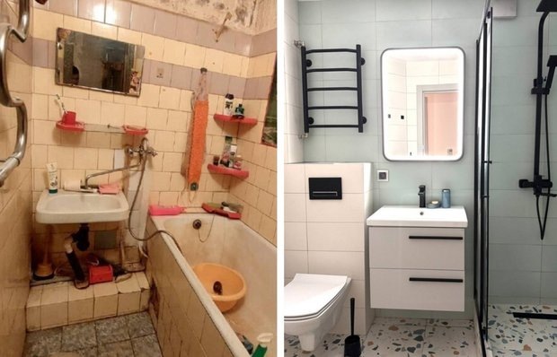 Разница до и после переделки кардинальная! Этот санузел в двухкомнатной хрущевке преобразила дизайнер Анна Карачева. До переделки ванная комната и туалет были раздельными. Требовалось полностью преобразить «уставший» интерьер и создать современную обстановку, в которой продумано хранение и есть место для стиральной машинки. Изначально в квартире располагались два крошечных санузла. Один из них представлял собой тесный туалет с унитазом, а во втором находились ванна и небольшая раковина. Такая планировка создавала определенные неудобства: отсутствовали места для установки стиральной машинки и хранения вещей. Помещения выглядели грязными, темными и неуютными. В рамках перепланировки санузел объединили. Это решение не только значительно увеличило пространство, но и позволило более эффективно использовать каждый квадратный метр. Окно между ванной и кухней оставили, но немного перенесли, что сделало возможным установку душевой кабины. Стены облицевали плиткой в нежно-бирюзовом и белом цвета