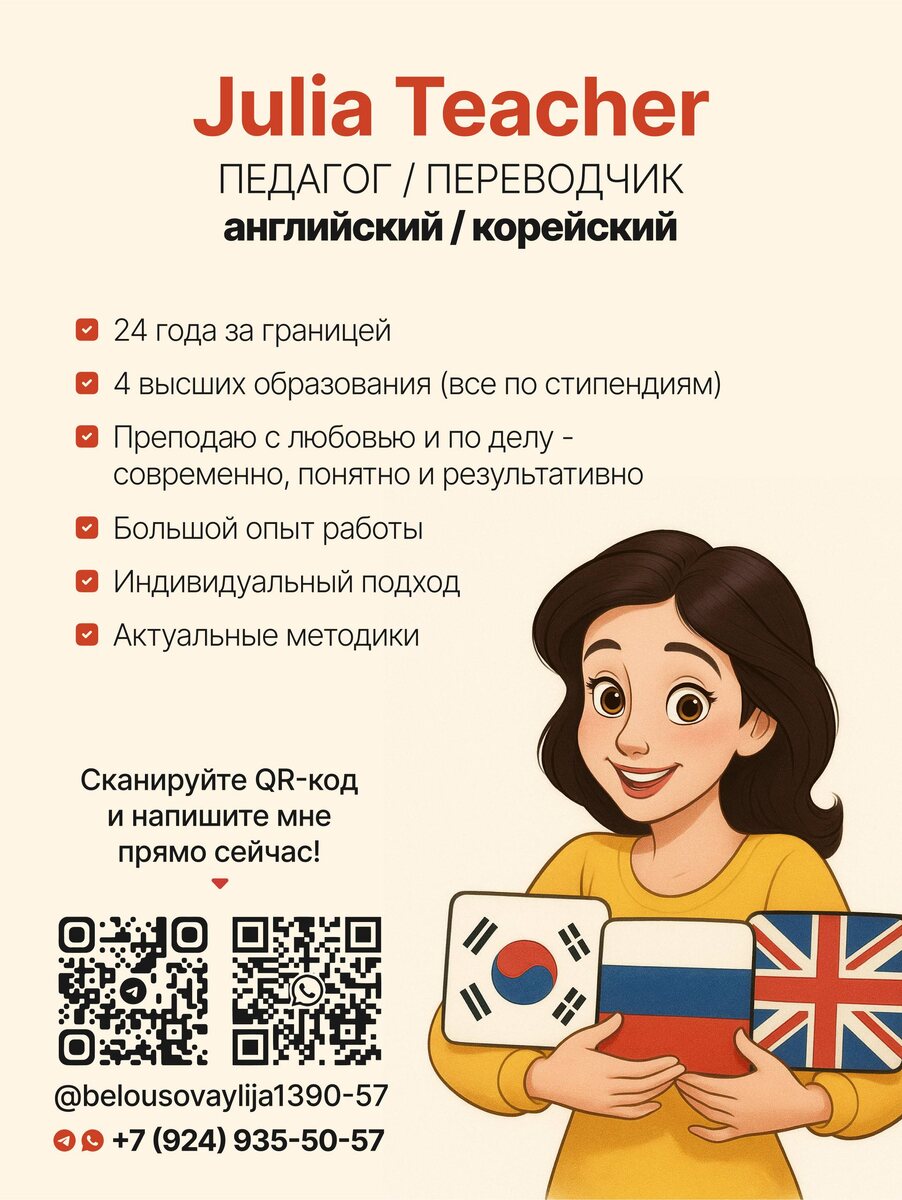 ✨ Друзья, хочу порекомендовать вам человека, которого я по праву считаю лучшим педагогом по английскому и корейскому языкам — мою сестру Юлию.
