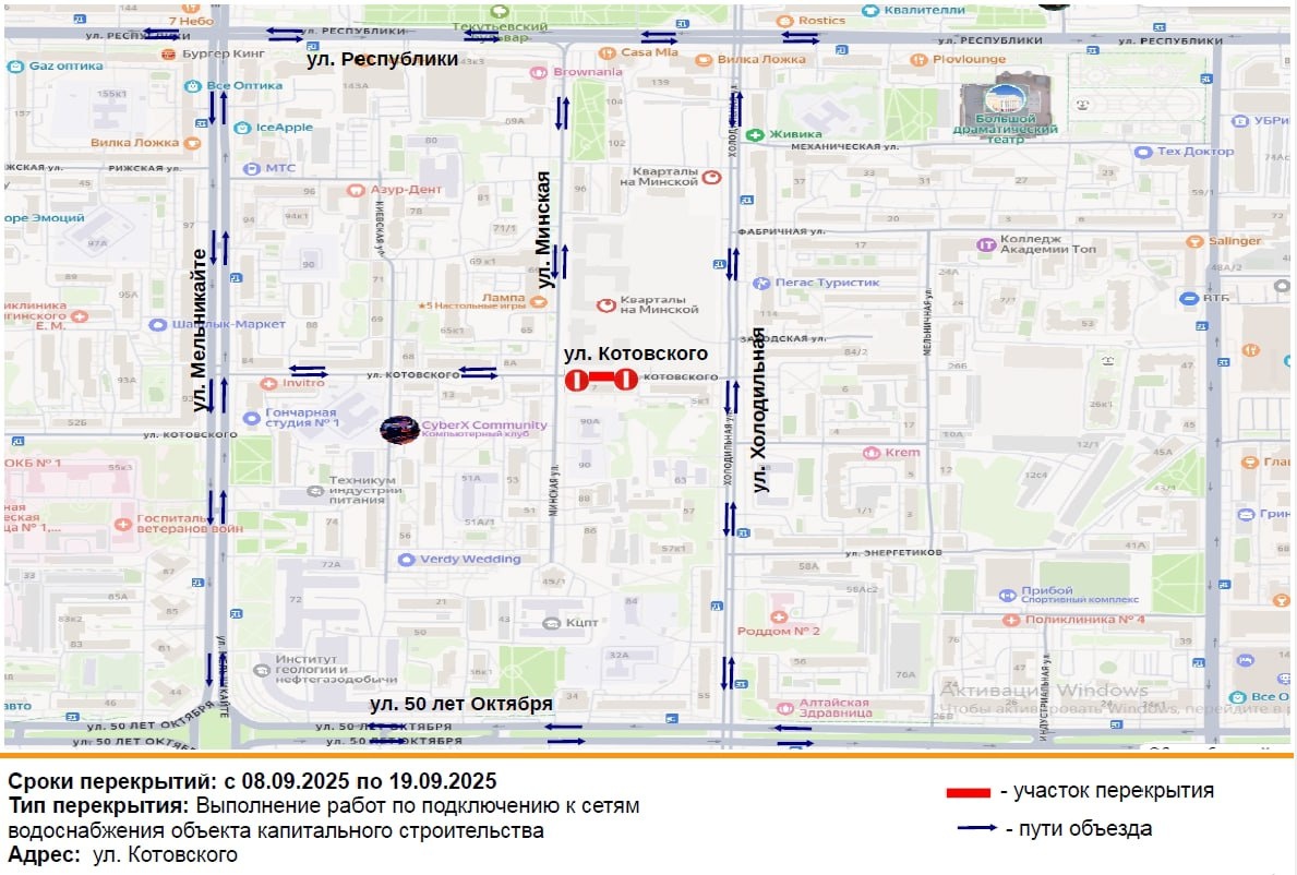 С восьмого и по девятнадцатое В связи с выполнением работ по подключению к сетям водоснабжения объекта капитального строительства с 8 по 19 сентября планируется прекращение движение транспортных средств по ул. Котовского, от дома № 5 до ул. Минской. Участников дорожного движения просим обращать внимание на знаки, заранее планировать маршрут, соблюдать Правила дорожного движения РФ. Возможные маршруты объезда: ул. Холодильная, ул. Республики, ул. Минская, ул. 50 лет Октября.