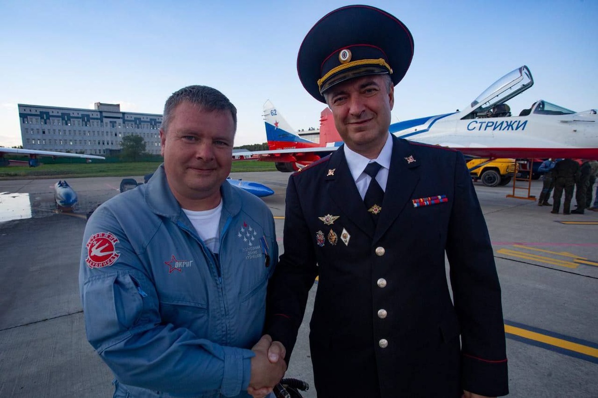 Знаменитый кузбасский «стриж» Денис Кузнецов удостоен ещё одной награды. Уроженец Юрги и командир пилотажной группы «Стрижи» получил медаль за многолетнюю дружбу и плодотворное сотрудничество с транспортной полицией. Медаль вручил врио начальника Кузбасского ЛУ МВД России Артём Кирпиченко, сообщили в пресс-службе Управления. Он отметил, что для транспортных полицейских — большая честь и радость пообщаться с лётчиками из легендарной группы. Как писал A42.RU, в апреле Денис Кузнецов был удостоен звания «Заслуженный военный лётчик Российской Федерации». Добавим, что в Кузбасс прибыли 9 пилотов и 20 специалистов по техническому обслуживанию. Впервые в составе «Стрижей» в Кузбасс прилетела девушка — лейтенант Елизавета Федотова. Сегодня в 17:30 «Стрижи» покажут своё мастерство над Московской площадью в Кемерове.