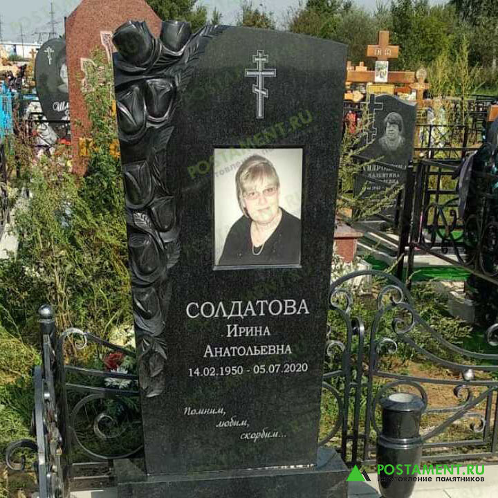Этот высокий, черный памятник, словно застывшая скорбь, был создан компанией «Постамент» за полтора месяца. В его основе – благородный карельский габбро-диабаз, камень, хранящий в себе вековую память. Надгробие установлено на Домодедовском кладбище. Слева на стеле расцвели крупные розы, высеченные рукой мастера. Каждый лепесток, каждый изгиб – результат кропотливой работы множества инструментов, воплотившей в камне живое дыхание природы. Полировка очернила резные элементы, наделила их глянцевым блеском и визуальной глубиной. Крест и надпись, также вырезанные вручную, покрыты прочной белой акриловой краской, контрастирующей с траурной чернотой камня. Цветы на фигурной надгробной плите выгравированы с помощью лазерного гравера пятого поколения, что позволило достичь удивительной точности и изящества. Прямоугольный портрет, словно окно в вечность, установлен в тщательно вырезанную нишу и надежно закреплен герметиком. Могила покрыта тротуарной плиткой и огорожена кованым забором, словно об