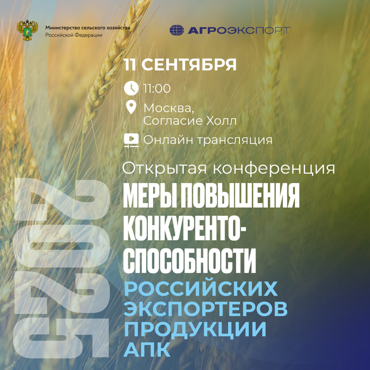 11 сентября 2025 года в 11.00 (МСК) «Агроэкспорт» совместно с Минсельхозом России проводит ежегодную открытую конференцию «Меры повышения конкурентоспособности российских экспортеров продукции АПК». 🔜 В рамках конференции состоятся: 🔵 пленарное заседание; 🔵 дискуссионная сессия «Инфраструктура поддержки экспорта продукции АПК». Участники мероприятия рассмотрят вопросы функционирования системы государственной поддержки и инициативы по ее совершенствованию. Представители федеральных и региональных ведомств расскажут о финансовых и нефинансовых инструментах, доступных отечественным экспортерам АПК, а руководители кредитных, страховых и логистических организаций – о выстроенной инфраструктуре экспортных продаж. Ключевые участники: 🔵 Максим Маркович, заместитель Министра сельского хозяйства Российской Федерации; 🔵 Илья Ильюшин, руководитель Федерального центра «Агроэкспорт»; 🔵 Алексей Солодов, вице-президент АО «РЭЦ»; 🔵 Артем Даушев, помощник руководителя Россельхознадзора; 🔵 Максим