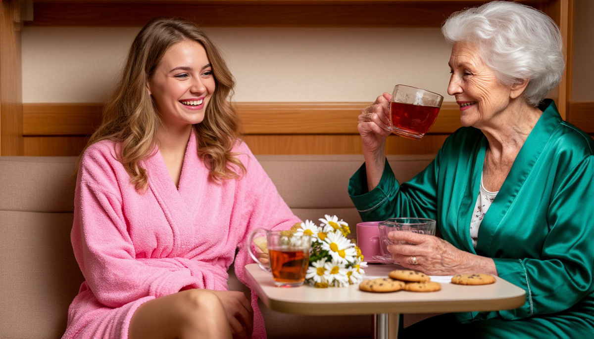 Как тут мне не расцвести было среди женского коллектива. Правда, немножко чувствовал себя сорняком и неловко среди белых одуванчиков и алой розы. Бабушек провожали их родственники, которые поухаживали за ними. Девушка же ехала одна. Помог ей расположить багаж под моей нижней полкой. Предложил посидеть со мной за столиком с чашкой крепкого ароматного индийского чая со слоном. Достал свой большой термос с чаем, положил на салфетку на стол свои любимые загорелые бублики с маком.