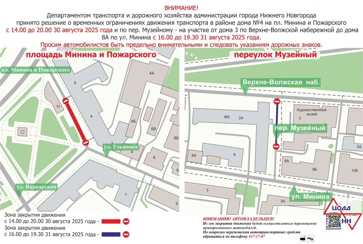 Ограничения движения введут на нескольких улицах в центре Нижнего Новгорода в последние выходные августа. Они необходимы для проведения музыкального фестиваля. Об этом сообщили в мэрии. Так, с 14:00 до 20:00 30 августа будет перекрыт участок улицы Ульянова в районе дома № 4 по площади Минина и Пожарского. С 16:00 до 19:30 31 августа ограничения вводятся на участке Музейного переулка от дома № 3 по Верхневолжской набережной до дома № 8 по улице Минина. Объехать эту зону можно будет по прилегающим улицам. Читайте такжеПассажирам приготовиться: какие маршруты изменят в Нижнем Новгороде в сентябре Ранее сообщалось, что трамваи №2 в Нижнем Новгороде запустят по сокращенному маршруту в сентябре. Самые интересные и срочные новости читайте в Telegram-канале «В городе N»