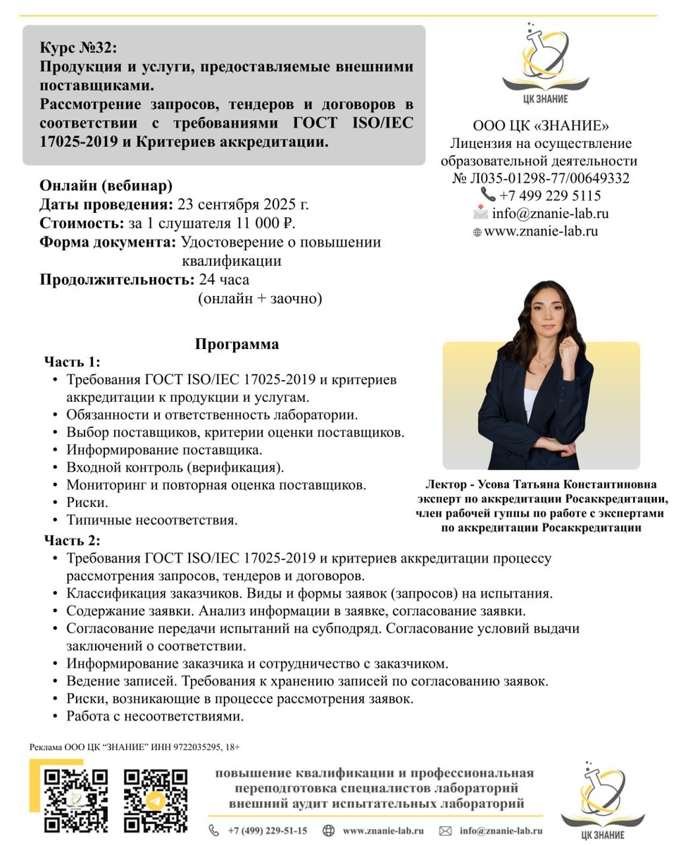 Коллеги, на Курсе № 32 разберем, как прописать в СМ ИЛ процедуры, касающиеся продукции и услуг, предоставляемые ИЛ внешними поставщиками, что отразить в СМ относительно работы с заказчиками, разберем формы записей. Приглашаем присоединиться к обучению, заявку необходимо направить на эл. почту info@znanie-lab.ru. Прилагаем форму заявки и программу курса.