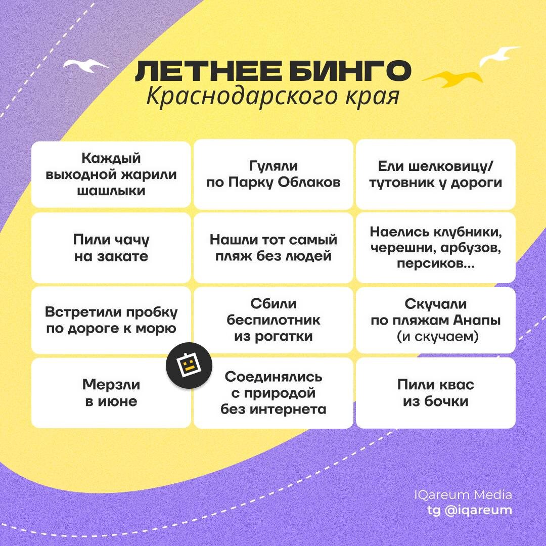 😐 Провожаем лето Чтобы вспомнить, каким оно было, собрали бинго ⤴️ У редакции, квасные усы не обсохли А у вас? 😉 Кстати, что там по ягодам? ❤️ — тутовник 🔥 — шелковица #аква_мем @iqareum 💜