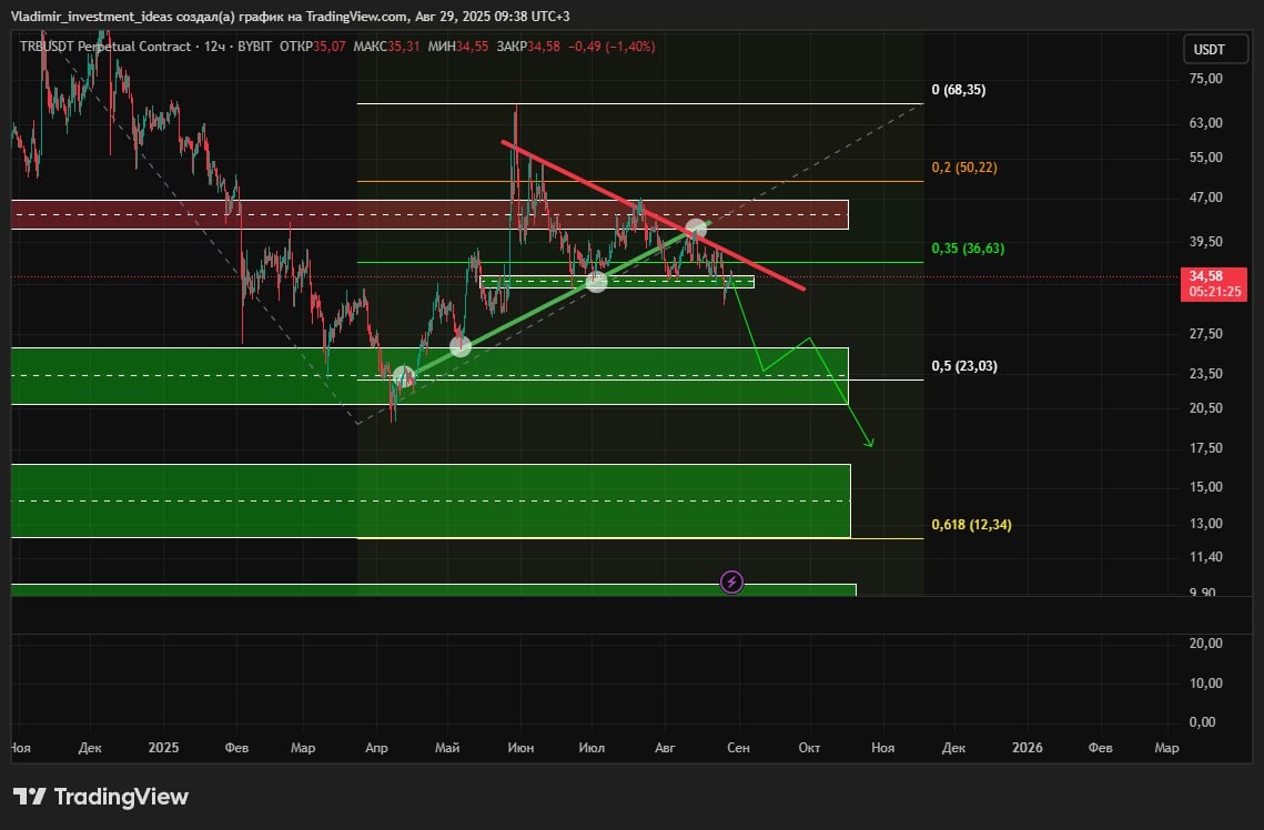 #TRB монета пробила восходящий тренд и соответственно сменился тренд. Сейчас цена находится на поддержке. Но если уйдем снова ниже 32.87 то шорт продолжится до уровней 0.5 и 0.618 по фибе. Но скорее всего будет шорт так как закрепились под уровнем в 0.35 по фибе, после него зачастую к 0.5 приходим. Будьте внимательны и осторожны, учитывая что я биток жду вниз, я думаю TRB сопротивляться не будет и тоже спустится