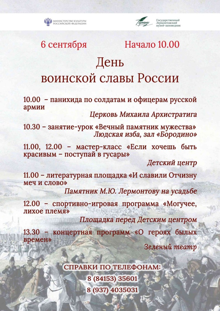 6 сентября в музее-заповеднике «Тарханы» пройдут мероприятия, приуроченные к Дню воинской славы России – Дню Бородинского сражения. Этот день стал «вечным памятником мужества и отличной храбрости российских воинов». У деревни Бородино состоялось самое кровопролитное однодневное сражение между французской армией Наполеона и русским войском под командованием М.И. Кутузова. Приглашаем вспомнить воинов русской армии на панихиде, посетить тематические интерактивные занятия и творческие площадки, а также познакомиться с репертуаром фольклорного коллектива музея и услышать вокальные композиции в исполнении победителей конкурса военной песни «Кто сказал, что надо бросить песни на войне…». Знакомьтесь с программой на нашем сайте: https://tarhany.ru/events/news/1953