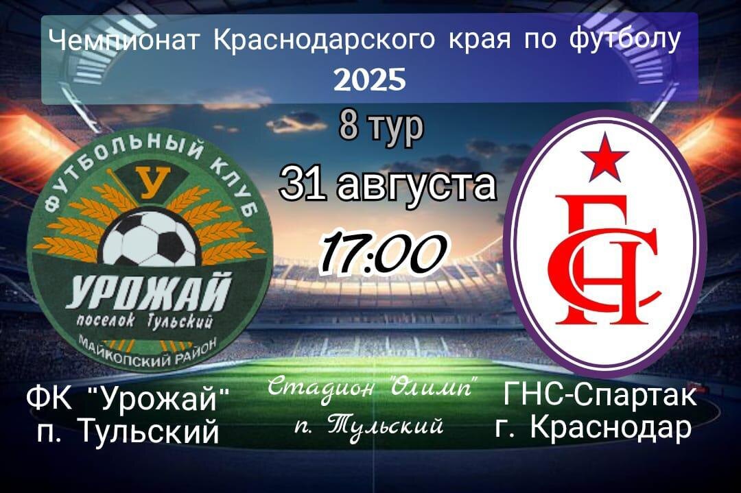 31 августа команда «Урожай» из поселка Тульского встретится с командой из г. Краснодар «ГНС-Спартак». Начало матча в 17:00. Место проведения — стадион «Олимп» в п.Тульском.