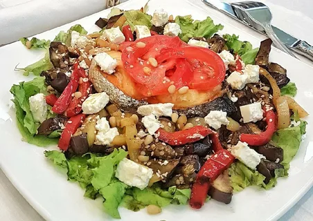 Этот салат у себя на родине знаменит как классический "греческий". Вариантов его приготовления множество, но в основе его всегда присутствуют запеченные баклажаны Ингредиенты: Рецепт приготовления 1)Помидоры и баклажаны помыть и обсушить. Чеснок очистить и нарезать тоненькими ломтиками. 2) Баклажаны разрезать вдоль, а потом сделать в мякоти надрезы сеточкой. В эти разрезы вставить чесночные ломтики. 3)Так подготовленные половинки баклажан посолить и немного полить оливковым маслом. 4) Выложить подготовленные овощи на противень, застеленный любой бумагой для выпечки. 5) Помидоры слегка смазать оливковым маслом и добавить к баклажанам. 6) Поставить противень в духовку, разогретую до 180 градусов на 35 минут. 7) Затем запеченные овощи немного охладить, отделить всю мякоть от кожуры и сложить в объемную миску. Туда же вылить и сок, образовавшийся при запекании. 8) Лук, чеснок очистить и мелко нарезать и острый перец также мелко нарезать. 9) Нарезанные овощи добавить в миску к запеченн