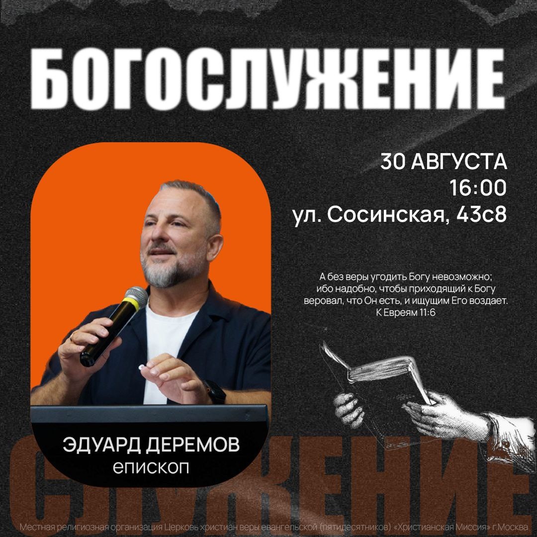 Дорогая церковь! Приглашаем вас на Богослужение! В эту субботу нам будет служить епископ Эдуард Деремов