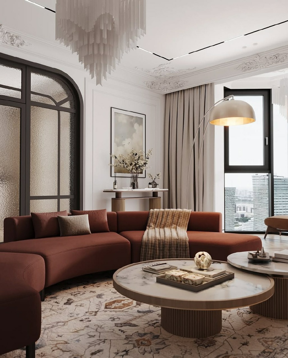 Здесь легко представить долгие разговоры с близкими или спокойные вечера с чашкой чая и хорошей книгой. Тёплый терракотовый диван в мягких изгибах создаёт динамику и подчёркивает характер пространства. А мраморные журнальные столики и фактурный ковёр с узором формируют атмосферу уюта, в которой хочется задержаться надолго 🌟