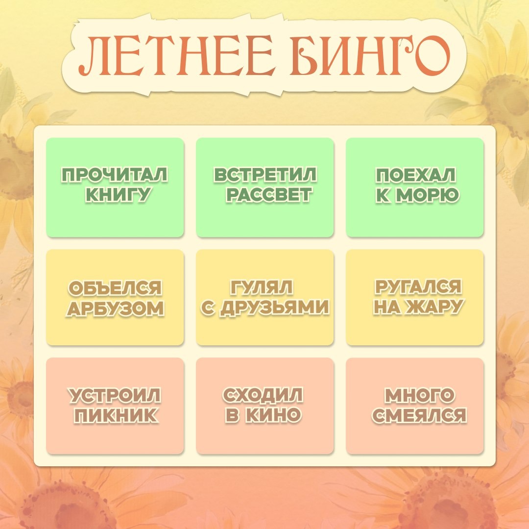 ☀️ Летнее бинго! ☀️ 🪄 Лето почти закончилось, и пора подвести итоги: отметьте то, что успели сделать за три тёплых месяца. Сколько пунктов вы выполнили? Делитесь в комментариях своими летними фотографиями! 📸✨