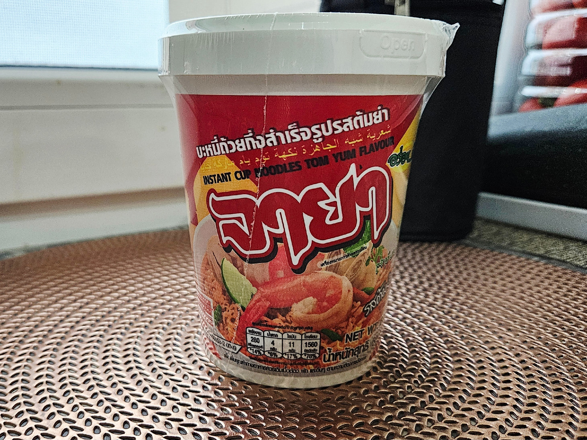 Поиски вкусной лапши со вкусом Том ям продолжаются. Сегодня расскажу про очередную тайскую. Лапша быстрого приготовления Jaya со вкусом Том ям Снова пластиковая баночка. Банка запаяна в пленку. После прошлого опыта скажу, что это не очень удобно, советую заваривать в обычной тарелке. Банка сильно нагревается и деформируется от кипятка. А крышка отлетает в процессе заваривания, при чем с таким сильным "чпоком", что я аж подскочила со стула от неожиданности 😁, хорошо хоть не в глаз отлетела. Либо ставьте тарелку сверху, иначе будете ловить ее потвсей кухне. Крышку. Возможно и тарелку. На банке все на нерусском языке ))), но есть наклейка с русским переводом. Но там не все, о чем написано в таблице с процентами, остается догадываться. Там есть перевод на английский и я так поняла, что это соотношение ингредиентов в пакете. Весь дизайн - это компоненты Том яма на лапше. Некое месиво, но так всегда на азиатских бич-пакетах. Мне кажется, у них один дизайн на все страны😄. На крышке