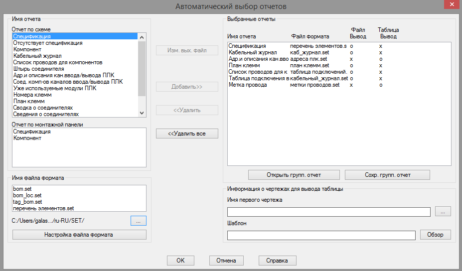 Инструмент Автоматические отчеты на панели Разное вкладки Отчеты позволяет автоматически формировать группу отчетов за одну операцию. Отдельные отчеты, входящие в группу, могут быть сохранены во внешних файлах, размещены на чертежах или оба варианта могут использоваться одновременно. Каждый отчет, входящий в группу, связан с файлом формата отчета (SET), содержащим настройки для этого отчета, в том числе: · Источник данных для формирования отчета, · Параметры отображения и вывода. Сохраненные файлы форматов отчетов (SET) в любой момент можно использовать как при генерации отдельных отчетов, так и группы отчетов. Файлы форматов (SET) для генерации группы отчетов создаются с помощью инструмента Настройка формата отчетов, размещенного на панели Разное вкладки Отчеты. После запуска команды открывается диалоговое окно «Настройки файла формат отчетов», которое содержит те же опции, что и при создании отдельных отчетов с помощью инструмента Отчеты. Но, кроме этого, имеются дополнительные наст