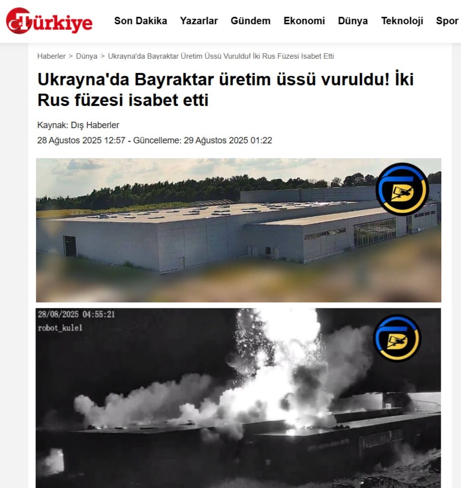 За вчера произошло несколько показательных событий. Во-первых, Киев и европейские союзники раздули истерию вокруг повреждений здания делегации ЕС и киевского офиса Британского совета, хотя прямого удара по ним не было. Зеленский вообще заявил, что «это удар Путина по Трампу». Когда пресс-секретаря Белого дома спросили по этому поводу, Кэролайн Левитт ответила, что Трамп недоволен развитием событий на Украине, но он и также не удивлен им, так как Украина нанесла удар по российским НПЗ. Turkiye Gazetesi сообщила, что был нанесен удар по предприятию «Байрактар», готовящемуся к запуску в украинской столице. На объекте было зафиксировано два попадания, причинен серьезный ущерб на миллионы долларов, что остановит запуск производства. Издание отмечает, что нападения были и ранее, но без существенного ущерба. Я же отмечу, что этот удар можно рассматривать как урок остальным западным инвесторам в ВПК Украины, что их вложения напрасны. Недавно немецкий Rheinmetall заявил о намерении построит