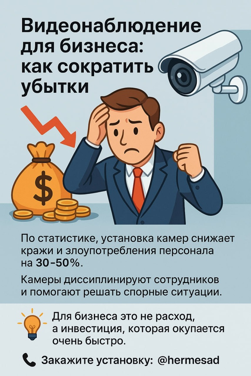 Видеонаблюдение для бизнеса: как сократить убытки По статистике, установка камер снижает кражи и злоупотребления персонала на 30–50%. Камеры дисциплинируют сотрудников и помогают решать спорные ситуации. 💡 Для бизнеса это не расход, а инвестиция, которая окупается очень быстро. — 📞 Закажите установку: @hermesad 💬 МЫ В MAX: https://max.ru/join/azfkAUyQXdP07i5KIMq1kKb9PTbeFzMDL9KWz_jhHsg САЙТ: https://mojmaster.ru/ ДЗЕН: https://dzen.ru/mojmaster?share_to=link VK: https://vk.com/ProtectedVision TELEGRAM: https://dzen.ru/id/68ac74d51b50f2261d0d97f7 AVITO: avito.ru/brands/baby-time INSTAGRAM: https://www.instagram.com/mojmaster.ru?igsh=MXJkNHcyZW5xYnNlMw== #Смета #Видеонаблюдение #Проект #Прозрачность #ПожарнаяБезопасность #МонтажПодКлюч #БесплатныйВыезд #MojMaster