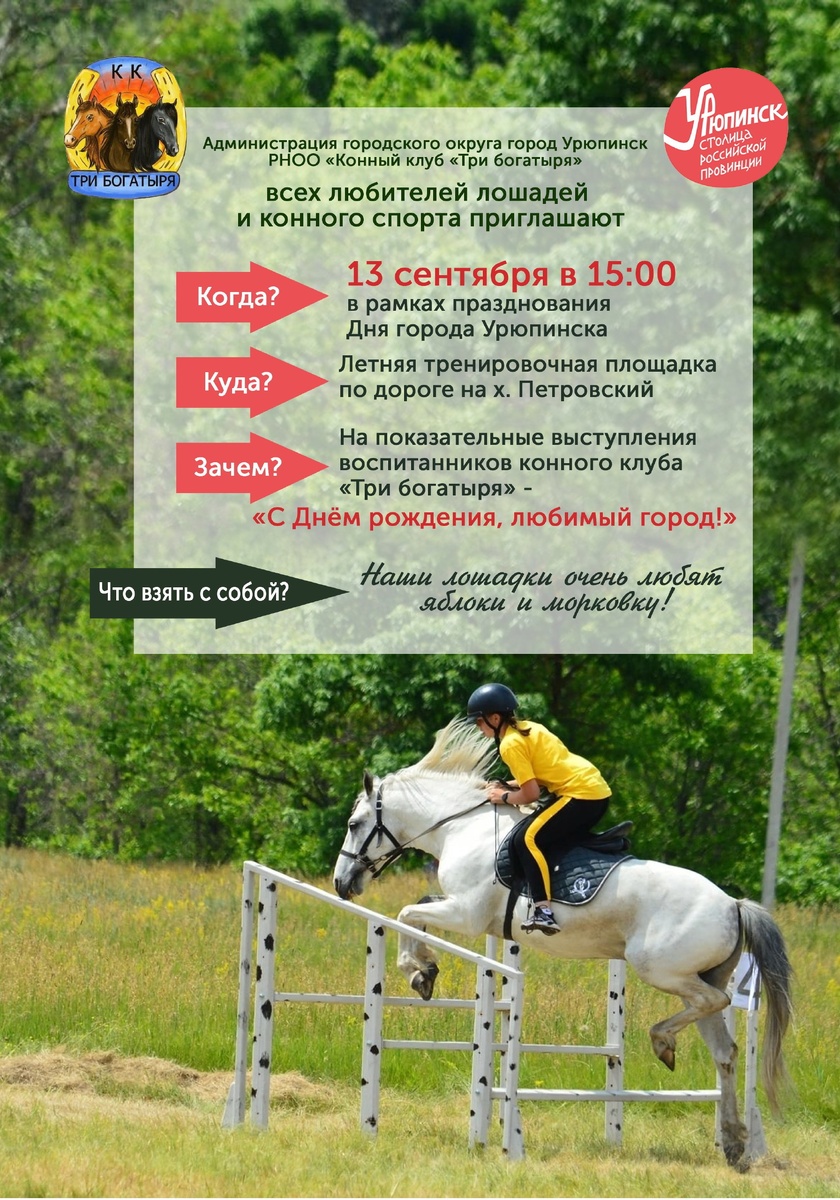 🎊Продолжаем анонсировать праздничные мероприятий, которые планируются к проведению в рамках празднования Дня города Урюпинска! Сегодня - Конный клуб "Три богатыря"! #Урюпинск407 #ДеньГорода #СДнемРожденияУрюпинск #администрацияУрюпинска